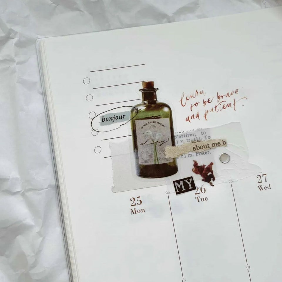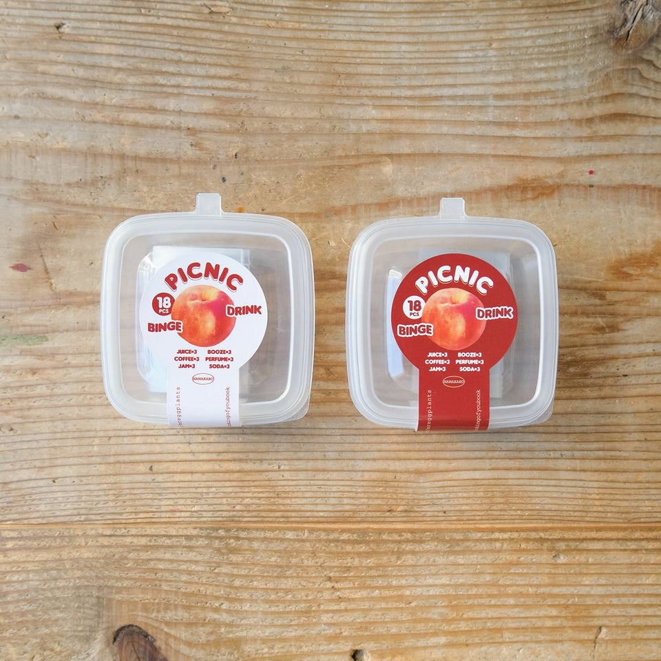 手帳をこよなく愛し、手帳好きのための文房具を展開する台湾のグラフィックデザイナー・茄子先生。保存容器を思わせるケースに入っているのは、ジュースやジャムなど、ピクニックをテーマにしたフレークシール! クリアなプラスチック素材でできているので、手帳やノートにぺたりと貼ると、くっきりきれいにデザインが浮かび上がります。