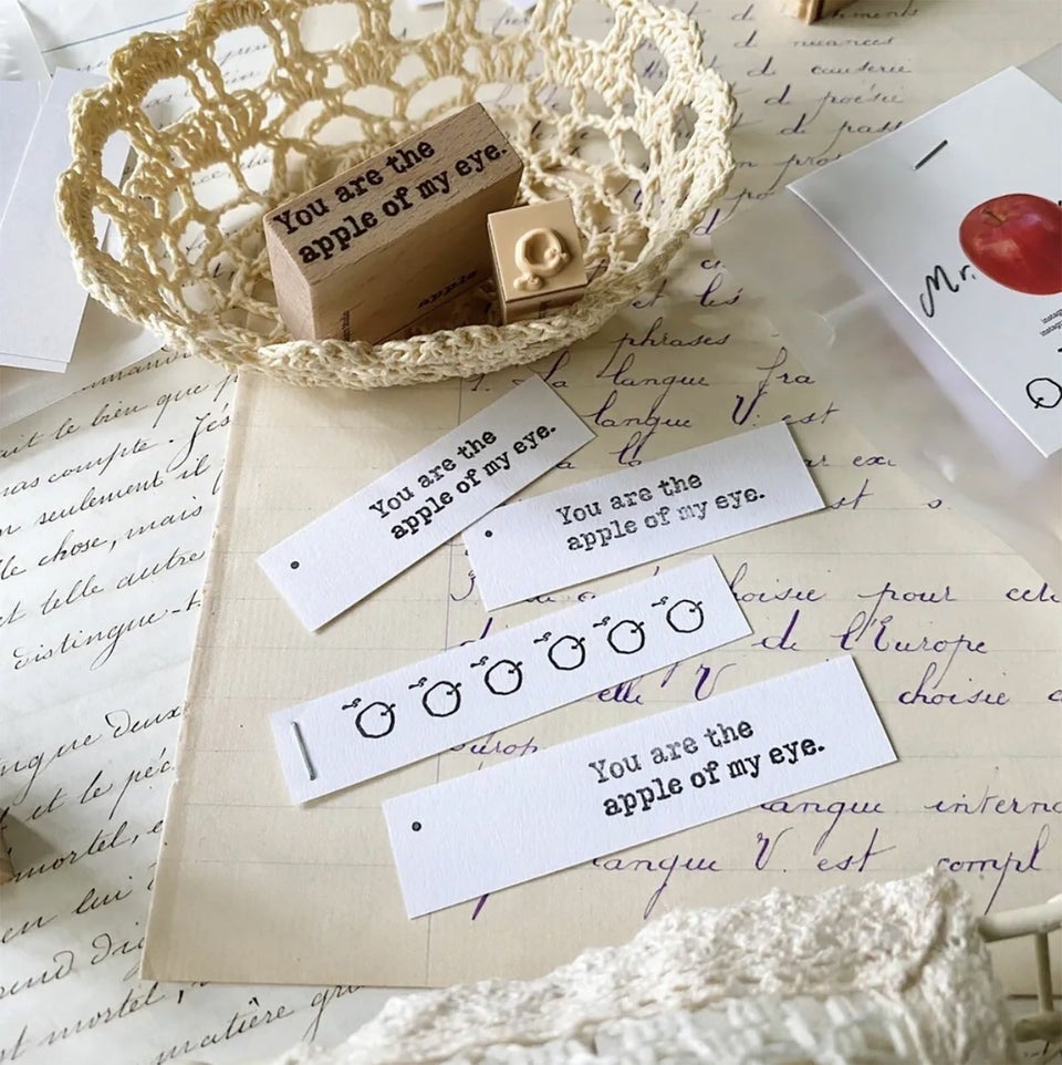 「Apple」のセットに記されている「You are the apple of my eye.」は、「目に入れても痛くないくらい愛おしい」という意味。
