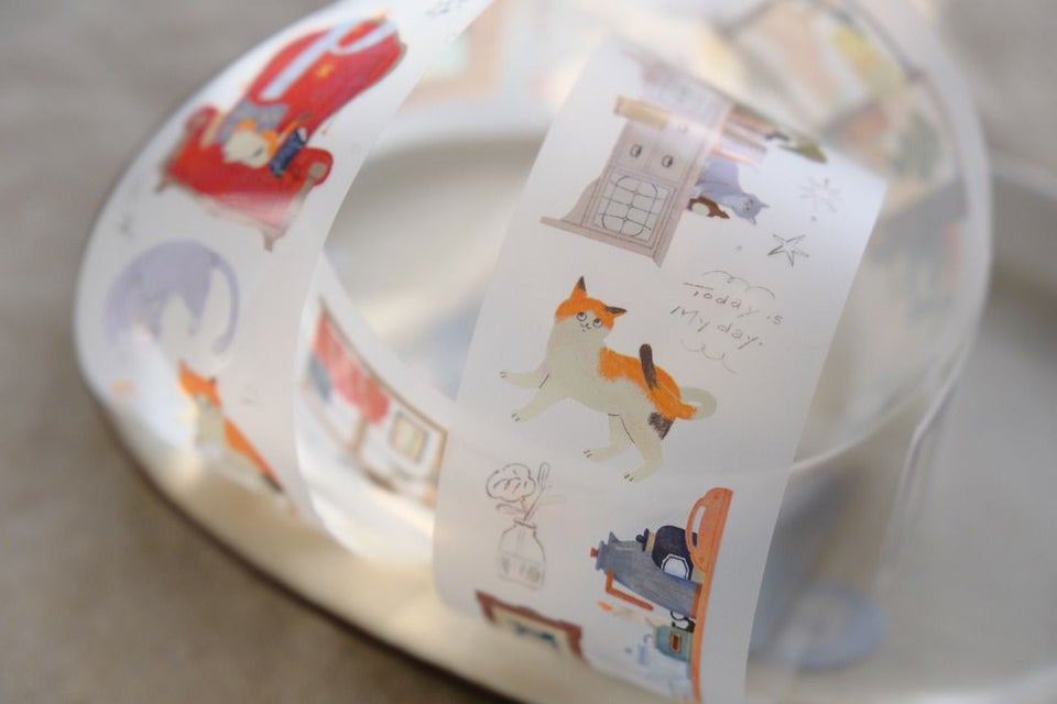「Life With Cats 」は、猫とともに暮らす穏やかな日常を切り取ったデザイン。お気に入りの場所で気ままに寝転ぶ猫たちの姿は、見ているだけで肩の力がふっと抜けます。PETテープならではの透明感を活かして、他の素材に重ねて貼るのもおすすめ。手帳やカード、ラッピングに使えば、まるで猫たちが寄り添ってくれるようなあたたかさを添えてくれますよ。