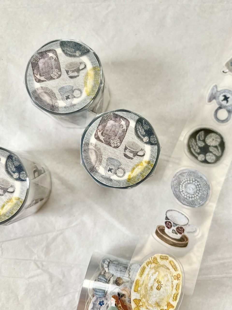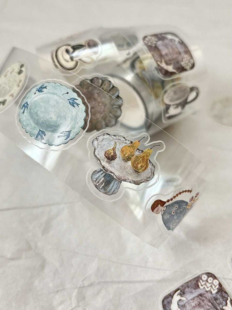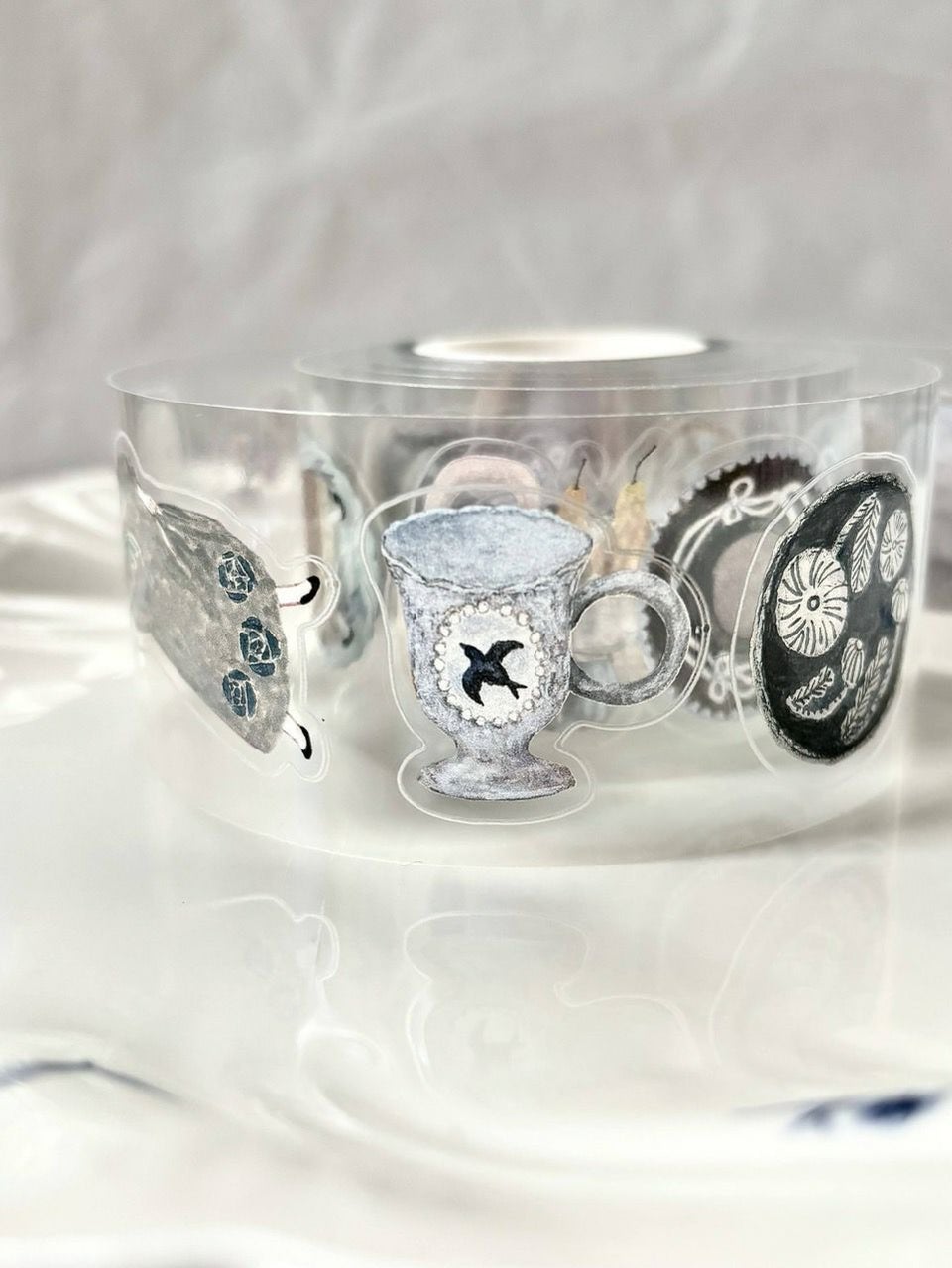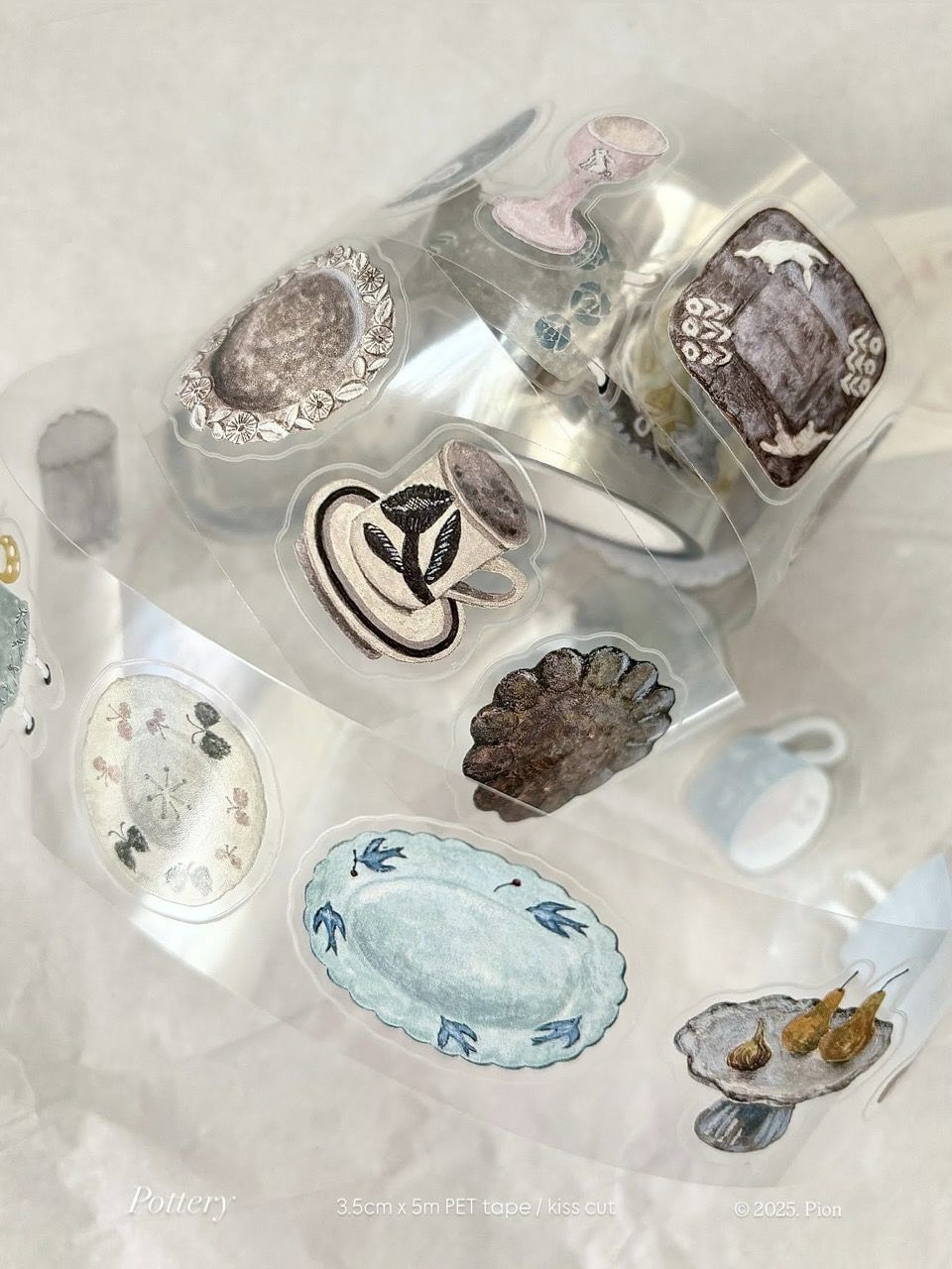 「Pottery」は、食器や雑貨をモチーフにしたイラストが魅力のPETテープ。アンティークな雰囲気を感じるデザインです。透明素材のPETテープならではの抜け感があり、紙の上にそのまま貼っても、ほかの素材と重ねても美しく馴染むのがポイント。さらに、絵柄に沿ってカットされているため、ハサミ要らずでシールのように手軽にコラージュが楽しめます。