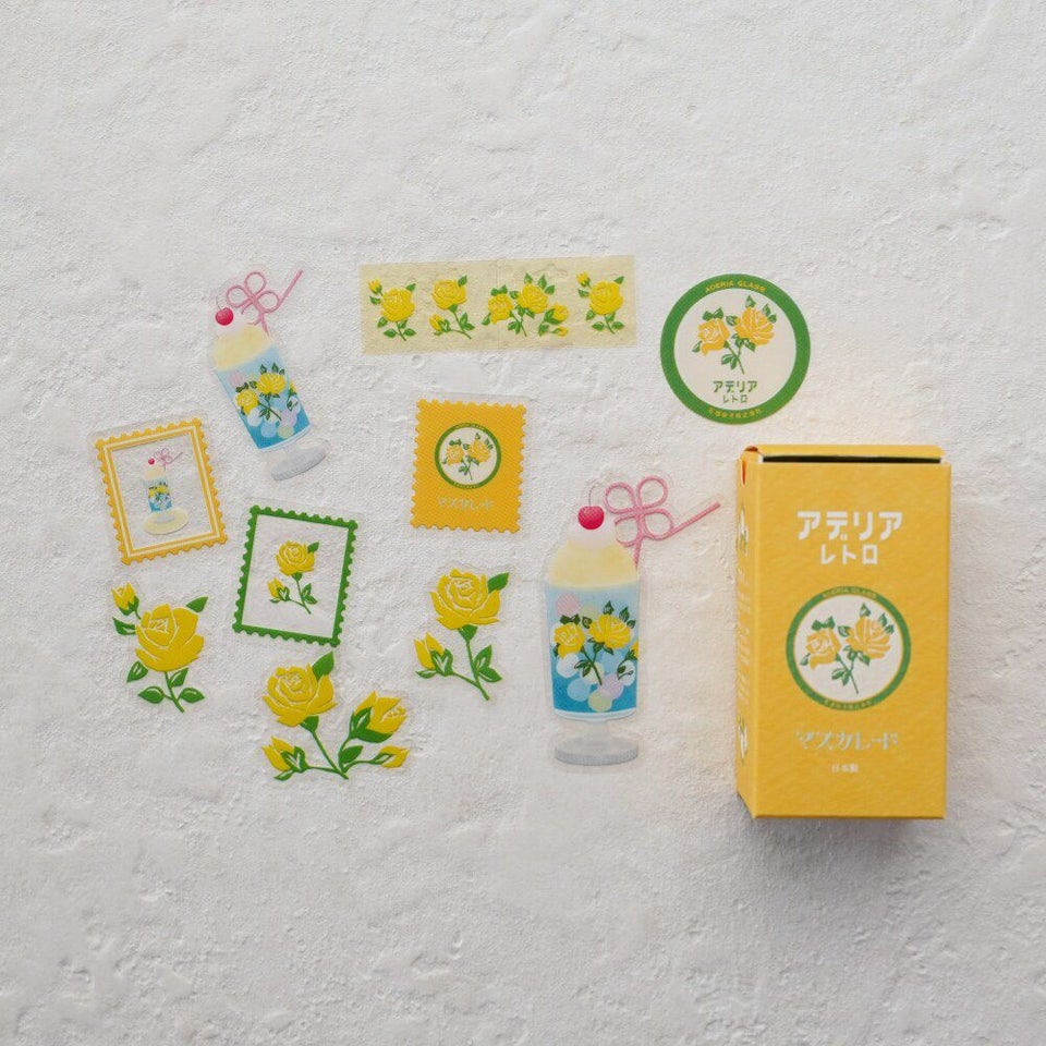 グラスやアデリアレトロのロゴ、切手型、長方形のテープ型など、いろいろなモチーフをフレークシールにしました。透明感のあるツヤっとしたシールがたっぷり入っています。パッケージもグラスの外箱を忠実にミニチュアに再現しました。