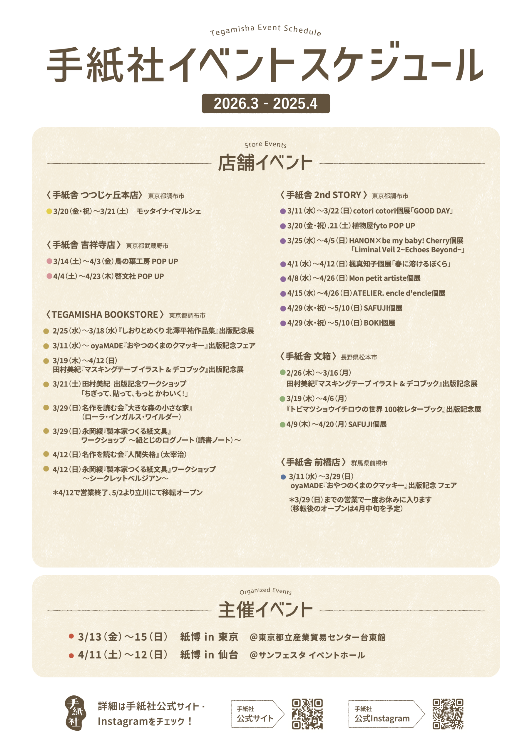 HOT NEWS 3〜4月のイベントスケジュールを公開! 2026.03.18 手紙社の各店舗では、日々、我々が敬愛する作り手による個展やPOP UPイベントを開催中。その道のプロフェッショナルと一緒に手を動かしながら楽しめるワークショップもやっていますよ。「東京蚤の市」や「紙博」など、主催イベントの情報もお見逃しなく! « 前のお知らせへ お知らせ一覧