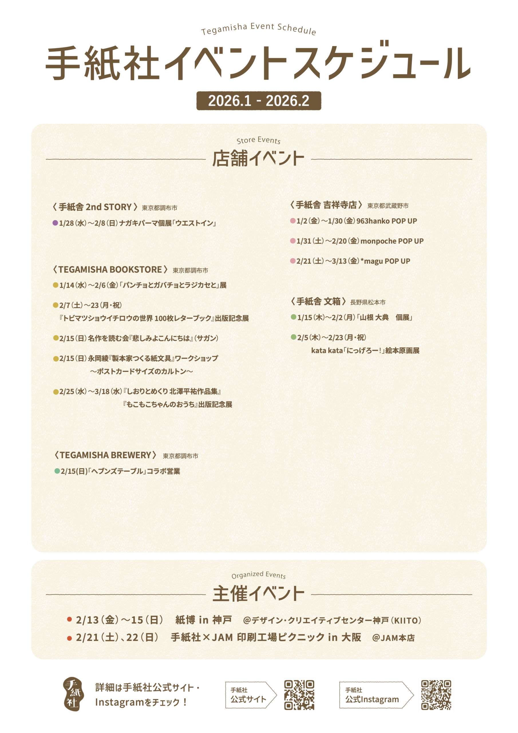 HOT NEWS 1〜2月のイベントスケジュールを公開! 2026.02.01 手紙社の各店舗では、日々、我々が敬愛する作り手による個展やPOP UPイベントを開催中。その道のプロフェッショナルと一緒に手を動かしながら楽しめるワークショップもやっていますよ。「東京蚤の市」や「紙博」など、主催イベントの情報もお見逃しなく! « 前のお知らせへ お知らせ一覧