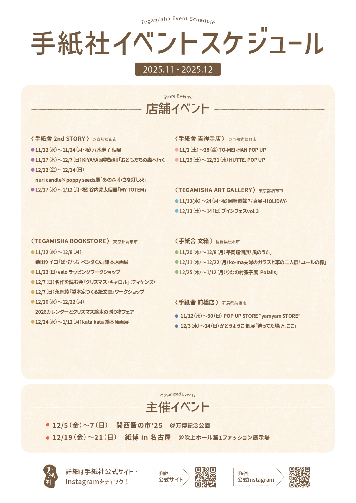 HOT NEWS 11〜12月のイベントスケジュールを公開! 2025.11.23 手紙社の各店舗では、日々、我々が敬愛する作り手による個展やPOP UPイベントを開催中。その道のプロフェッショナルと一緒に手を動かしながら楽しめるワークショップもやっていますよ。「東京蚤の市」や「紙博」など、主催イベントの情報もお見逃しなく! « 前のお知らせへ お知らせ一覧 次のお知らせへ »