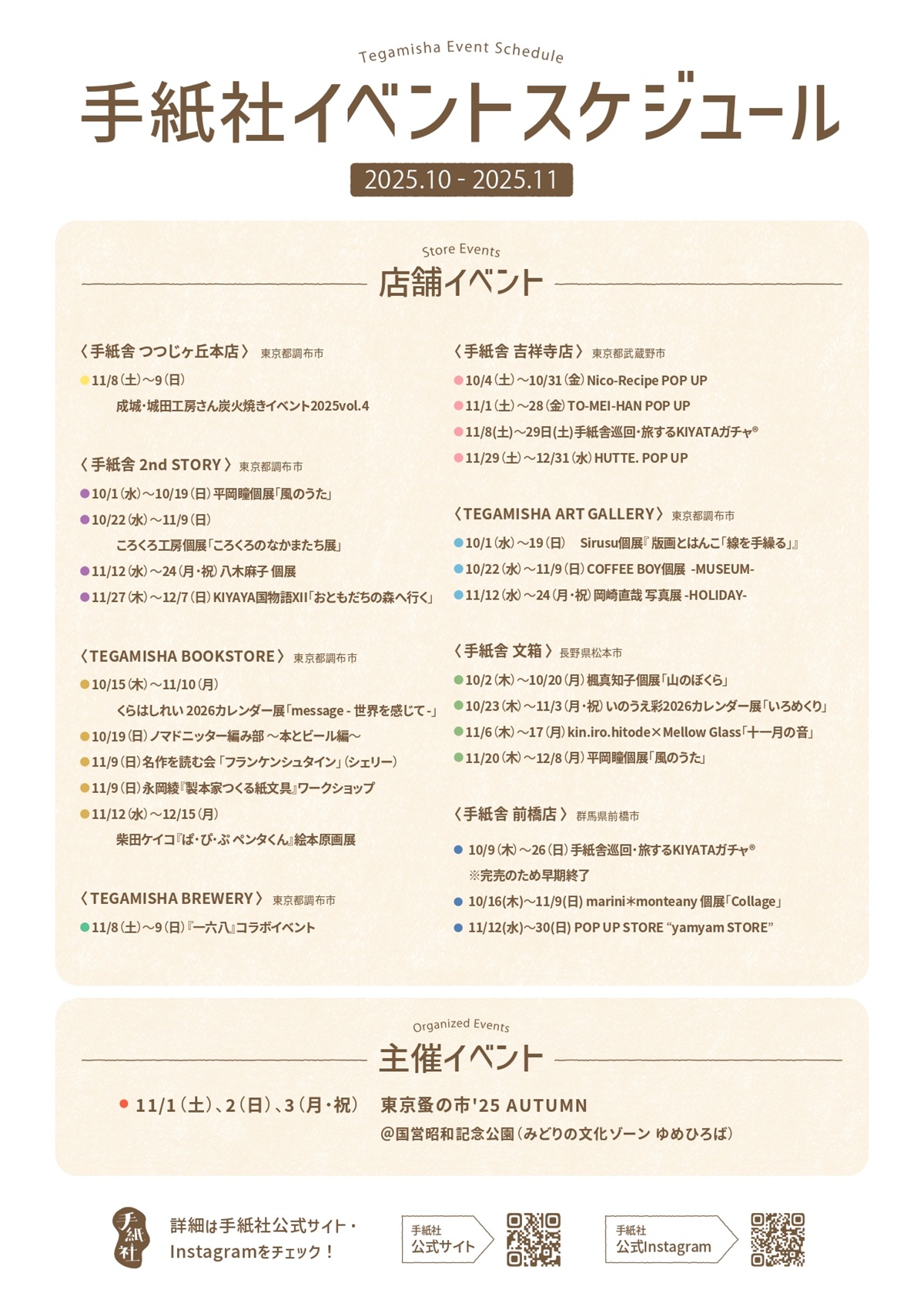 HOT NEWS 10〜11月のイベントスケジュールを公開! 2025.10.23 手紙社の各店舗では、日々、我々が敬愛する作り手による個展やPOP UPイベントを開催中。その道のプロフェッショナルと一緒に手を動かしながら楽しめるワークショップもやっていますよ。「東京蚤の市」や「紙博」など、主催イベントの情報もお見逃しなく! « 前のお知らせへ お知らせ一覧
