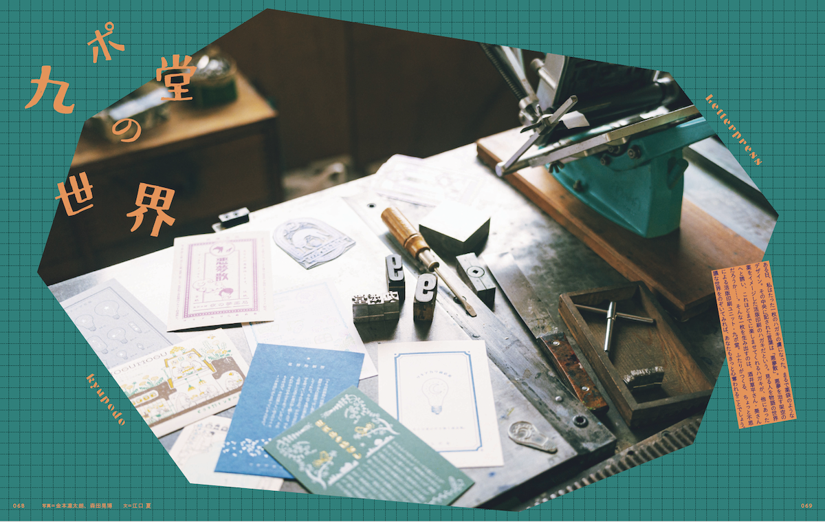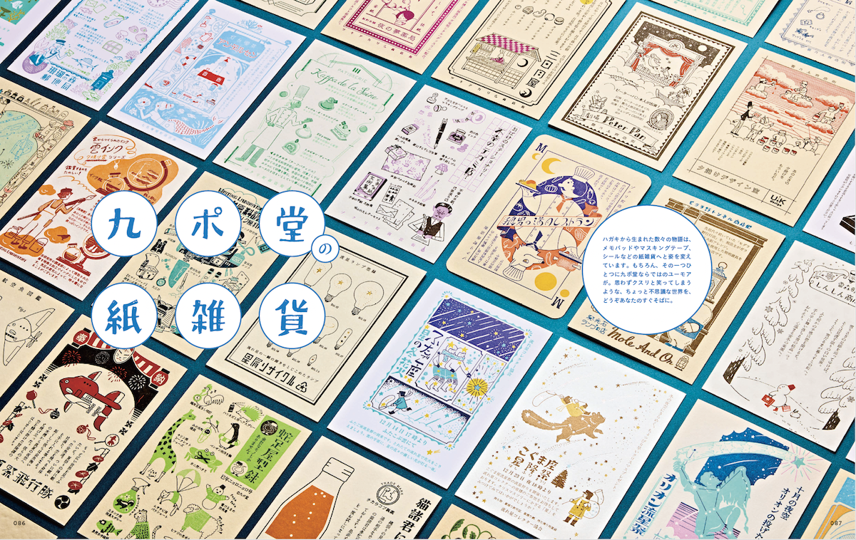 第2特集は、活版印刷ユニット・九ポ堂の作品づくりの裏側やオリジナルの紙雑貨をご紹介する「九ポ堂の世界」。物語性のあるハガキを活版印刷で生み出す九ポ堂の、ちょっと不思議な世界を余すことなくお届けします。7ページにわたりご紹介する「ハガキコレクション」では、現在展開されているハガキのほぼ全柄を一挙ご紹介。ファン必見の内容です!