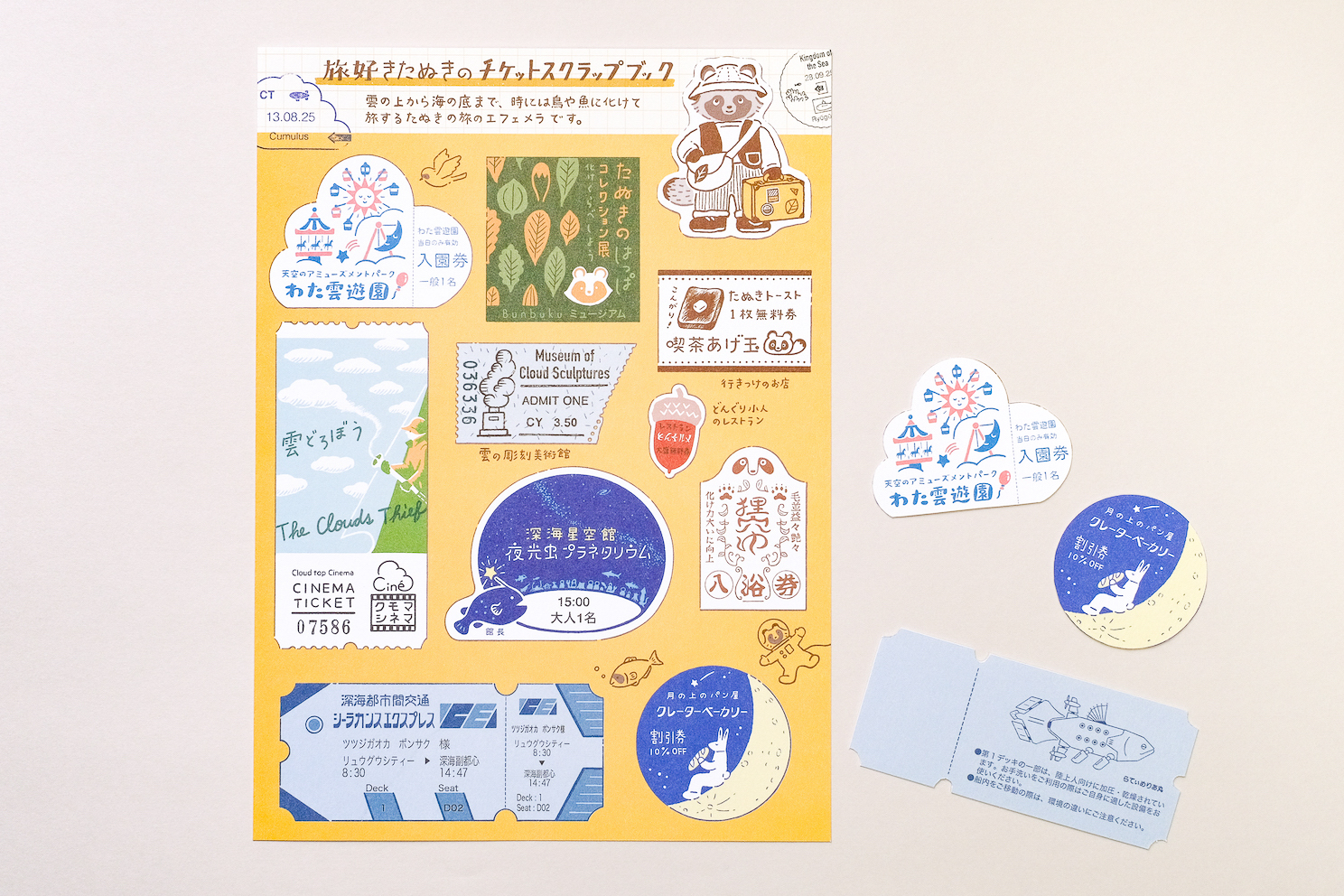 今号のとじ込み付録は「九ポ堂 チケット風カード」。天空のアミューズメントパーク「わた雲遊園」の入園券や、どんぐり小人のレストラン「どんぐルメ」の大盛無料券など、九ポ堂が架空のチケットを描きおろしてくれました。ページを自由に切り取って、コラージュの素材に使ったり、ラッピングに添えたり、思い思いに付録を楽しんでくださいね!