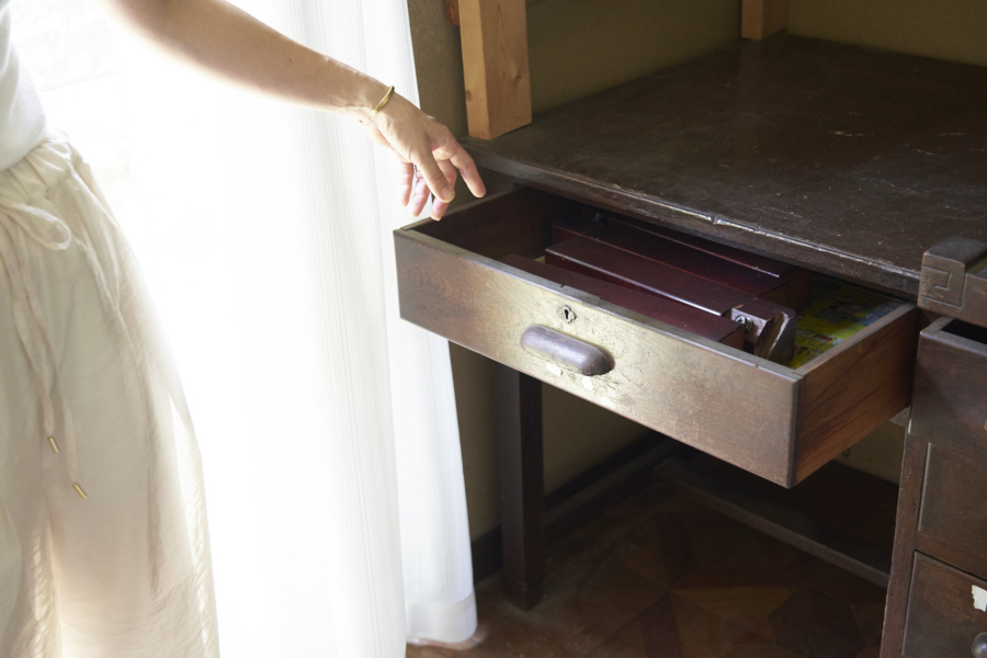 レトロな意匠の家具類 鈍く光る金具が美しいデスク。物を大切にすることが好きだったそうです。