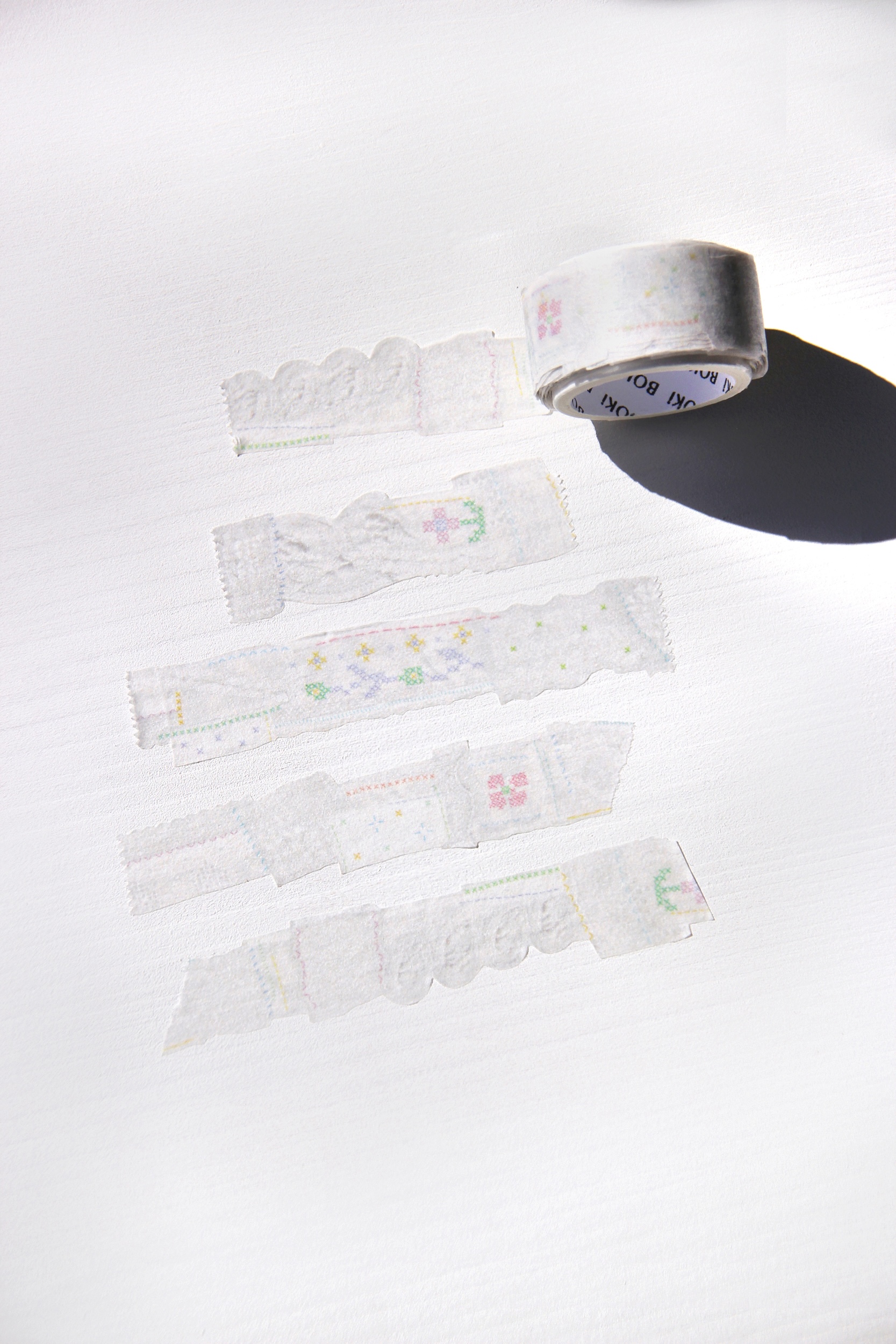 柄ごとに質感や印刷方法を細やかに調整し、リアルな仕上がりを追求した紙製品を展開するBOKI。レースやリボン、布の風合いを繊細に表現したマスキングテープは、落ち着いた色彩とクラシカルな佇まいが魅力です。さらに、モチーフに沿って施された型抜き仕様により、手帳やラッピングに取り入れるだけで印象的な仕上がりをお楽しみいただけます。
