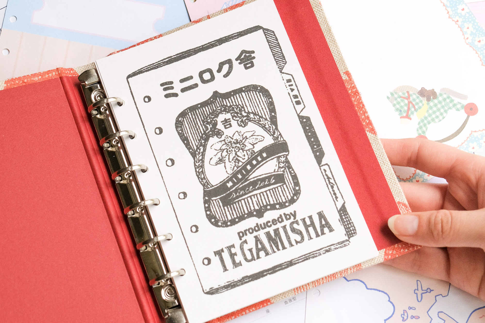 ミニロク舎のロゴマークは、手紙舎 吉祥寺店と同じく、ガリ版による独特の風合いと細やかな線の描写が魅力のイラストレーター・いのうえ彩さんが手がけてくれました。いのうえ彩さんとコラボレーションしたミニ6リフィルやバインダーも販売いたします。