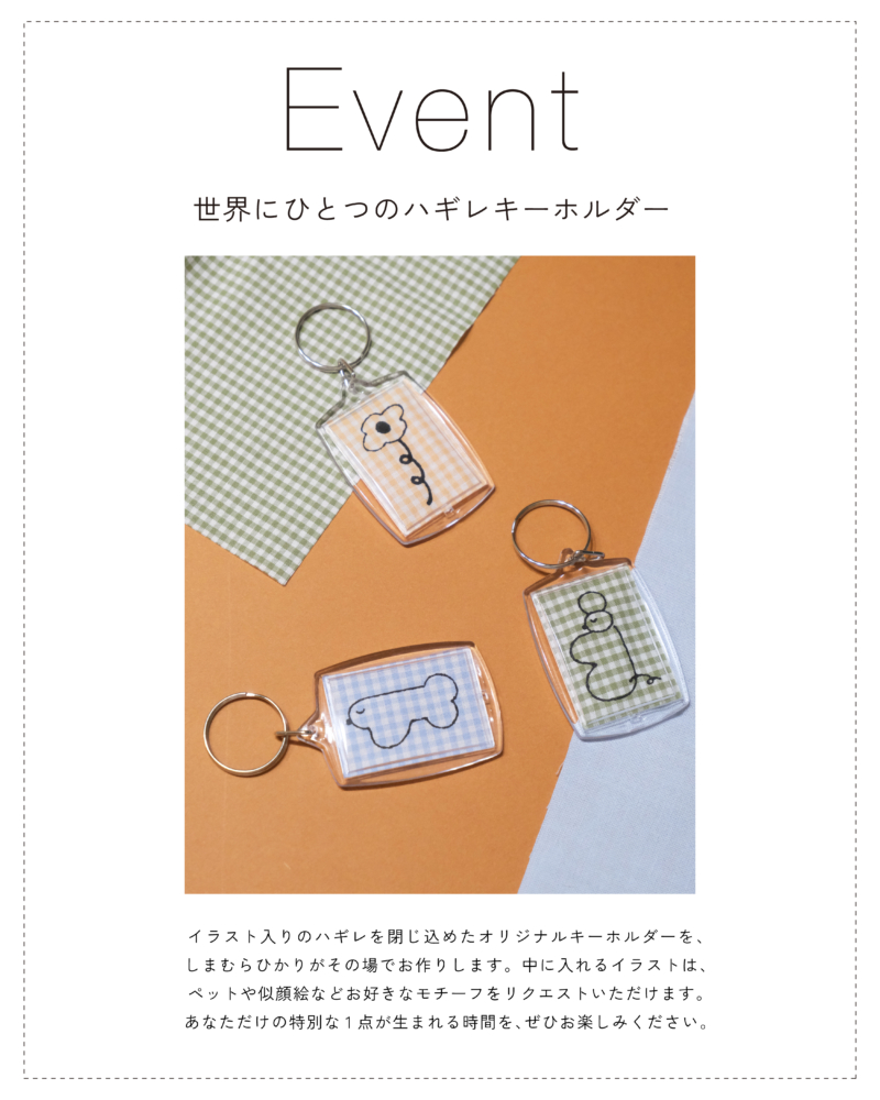 ゴールデンウィークの中の3日間、しまむらさんがあなたのリクエストに応じてハギレにイラストを描きます。それを閉じ込めたキーホルダー作りを行います。イラストは、ペットや似顔絵などお好きなモチーフでOK。あなただけの特別な1点が生まれる瞬間を、ぜひお楽しみください。