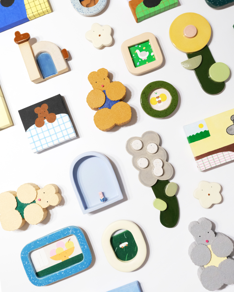 POP UP空間には、しまむらさんが今回のために制作してくださった原画や陶芸の一点ものの作品をはじめ、シールやポストカードなどの紙ものアイテムやキーホルダーが新たに登場します。
