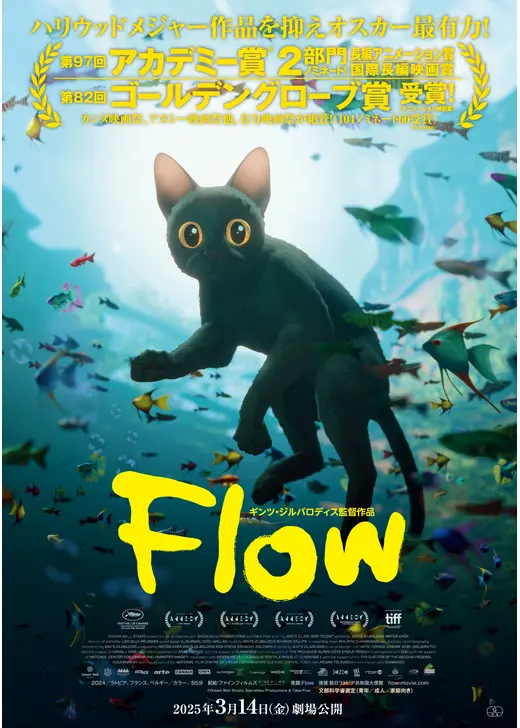 有坂:これは世界が大洪水に見舞われた中、一匹の猫が主人公で、その猫の目線で猫の旅路を描いたようなアニメーション作品となっています。これはもう猫が主人公で、船に乗って猫が旅をするんですけど、そこに猫だけではなくて、犬とか、カピバラとか、猿とかも一緒に旅をするということで、人間のいない世界を描いています。なので台詞は一切ありません。なので、字幕が読める、読めないとかっていうのも抜きにして、大人も子どももこれは絵と音だけを楽しめる、すごくシンプルにつくられながらも、85分、本当に見応えのあるアニメーション作品となっています。この映画をつくった人が、ちょっと名前覚えられないんですけど、ギンツ・ジルバロディスという人で、彼は、前作が『Away』というアニメーション作品で、これは監督、制作、編集、音楽全部一人で手がけた長編デビュー作。これが世界的に注目されたんですね。「ラトビアにヤバいアニメーション監督いるぞ」ということで、世界中の注目を集めた、第2作目としてこの『Flow』がつくられました。こちらは、個人制作ではなくて、大人数のスタッフと一緒に完成させたということで、監督としては個人制作から集団制作に切り替えるという意味で、できる可能性も広がりつつ、スタッフが関わる以上、その中でも自分の表現したいものをできるだけ失わないように制作していったということで、いろいろ紆余曲折があって、結果5年かかったそうです。完成した作品は、世界中のアニメーション賞で高い評価を受けていて、アメリカのゴールデングローブ賞では、ラトビア映画史上初の受賞を獲得したり、あとはアカデミー賞で長編アニメーション賞と国際長編映画賞の2部門にノミネートされて、長編アニメ部門を受賞したりということで、たったの2作で、オスカーを獲得したという意味で、アニメ大国日本のアニメファンは、絶対にスルーしてはいけない新しい才能が、このギンツ・ジルバロディス監督です。本当に映像と、自然の音だけの空間っていう、なんか心地良さもいいなと思いますし、個人的には、昔々、ディズニーがつくった『三匹荒野を行く』という実写映画があります。これは1963年の映画で、猫と犬のロードムービーなんですけども、それを感じさせる、あちらの作品も動物ばかりが出てきてセリフは一切ないということで、『三匹荒野を行く』をアニメーションでつくったような、そんなところも個人的にはちょっとグッとくる作品でした。これはできれば小さい画面ではなく。